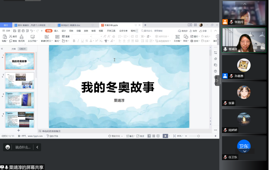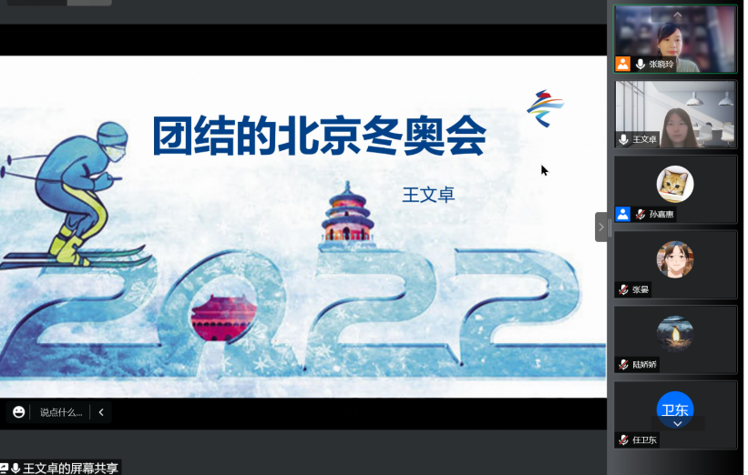 20级硕士生王文卓同学借助多张珍贵照片,回顾了自己作为奥委会主席巴赫先生的奥林匹克大家庭助理(OFA)志愿者的经历。作为巴赫主席3名助理志愿者之一,王文卓同志不仅担任其在德语方面的即时陪同翻译,也承担巴赫主席的工作日程翻译、交通工具及礼宾事宜的对接等工作。她对志愿者在工作中表现出的严谨精准及北外员工、北外学子在其中表现出的团结印象深刻。此外,王文卓同志还分享了自己于2008年北京夏季奥运会时埋下志愿者梦想的种子、2022年成功圆梦北京冬奥会的“奥运情缘”。