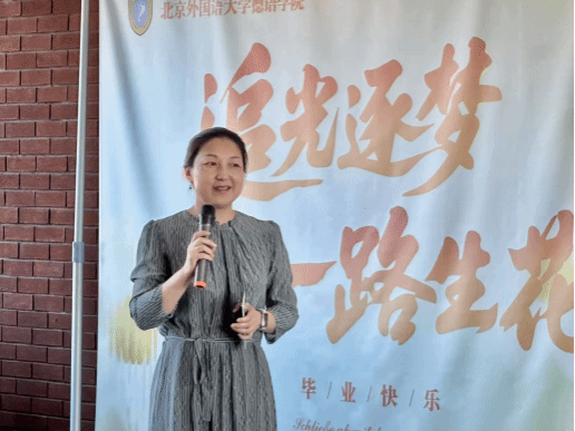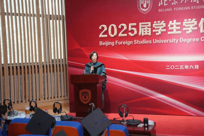 她深情回顾了从北外毕业后三次不同职业跨越式转型的经历,凝练出北外人特有的使命感、全球观与思辨力。她寄语毕业生以语言“元宇宙”校准世界脉搏,以终身学习锚定跨界价值,以向上向善温润文明,勇担北外人的时代使命。