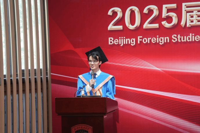 2025届硕士毕业生舒哲作为员工代表发言,他深情回顾了在北外本硕读书的七年时光,从零起点攻克德语,到系统研习德语课程,再到深耕语言学专业领域,跨越挑战的历程,使他在语言技能与学术素养上实现跃升,更教会他以探索者的姿态在专业之路上持续深耕,在毕业季的回望里,这些都成为北外赋予他最珍贵的勋章。他感谢所有老师、同学、家长,也希望每个毕业生于时光长河中,做自己的主角,把每一次“我想”活成掷地有声的行动,让每一个“我成为”都生长成独一无二的模样。