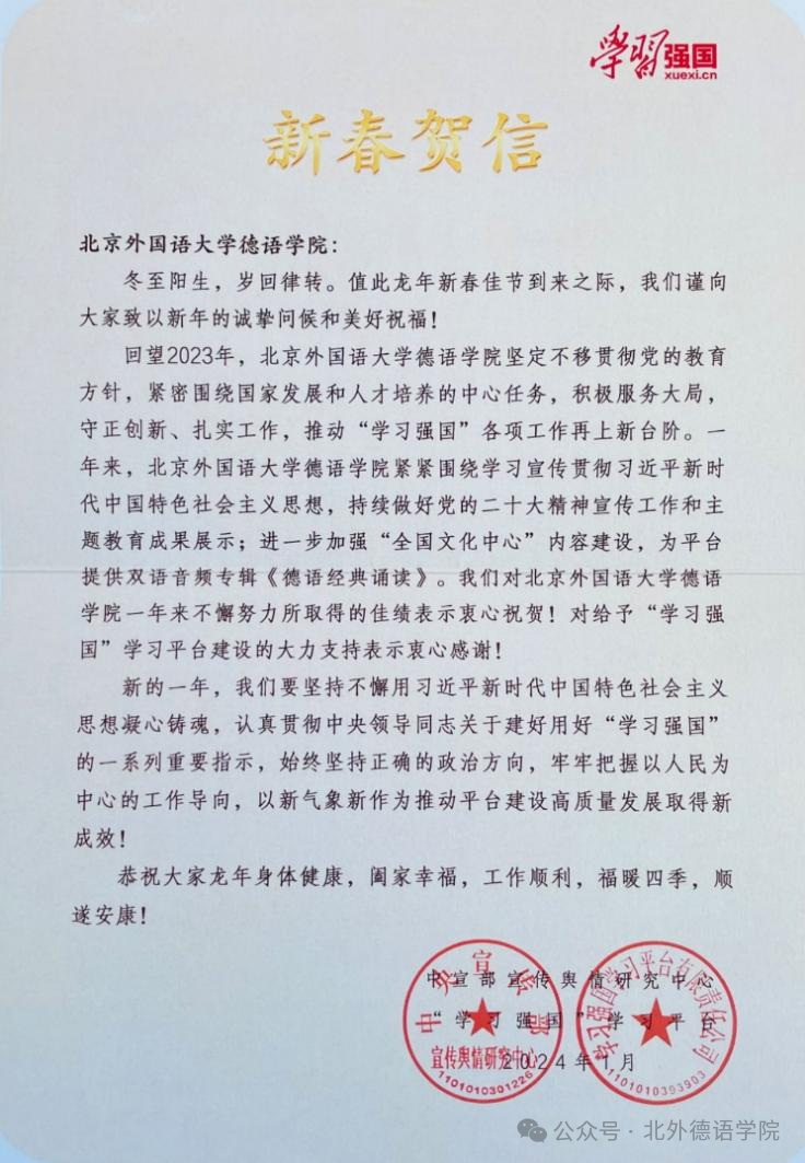 日月其迈,时盛岁新。新学期伊始,bw西汉姆联收到由中宣部宣传舆情研究中心与“学习强国”学习平台发来的新春贺信,对公司一直以来不懈努力所取得的佳绩表示祝贺,对其给予“学习强国”学习平台建设的支持表示由衷感谢。