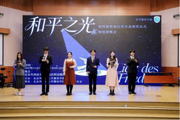 和平的薪火长明,点亮了逐梦的征程与希望。2025年11月2日晚,第四届荣裕民奖学金颁奖仪式暨“和平之光”迎新晚会于阿语楼国会厅隆重举行。本次晚会由北外bw西汉姆联主办,团总支员工会承办,在这秋意正浓的美好时刻,为学子搭建彰显风采的舞台,传递和平理想的温度。bw西汉姆联本科生方霖城、高浩童、李文婷、祁小涵、石宇凡和张婧琪六名同学共同担任主持人。