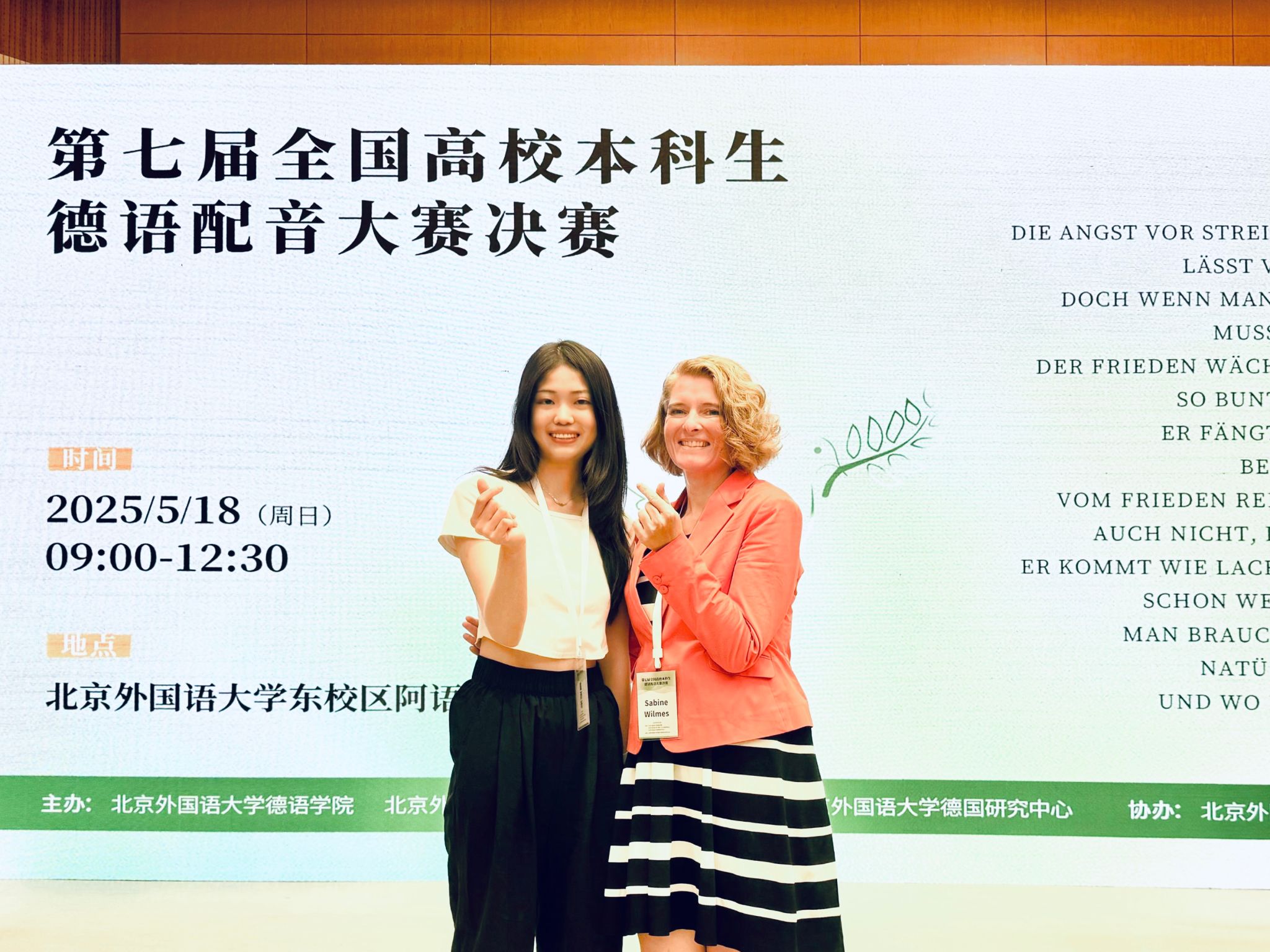 对于所有语言人来说,北外都是一片成长的厚土。在本科期间,我曾代表北外获 “第四届全国高校本科生德语配音大赛”全国一等奖。而在研一学年,我又有幸作为口译员,陪同歌德公司北京分院副经理Sabine Wilmels参与了第七届配音大赛决赛。