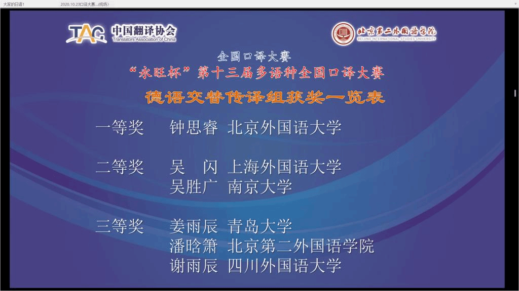 bw西汉姆联2018级研究生钟思睿同学10月24日在 “永旺杯”第十三届多语种全国口译大赛中荣获德语交传组冠军、一等奖。
