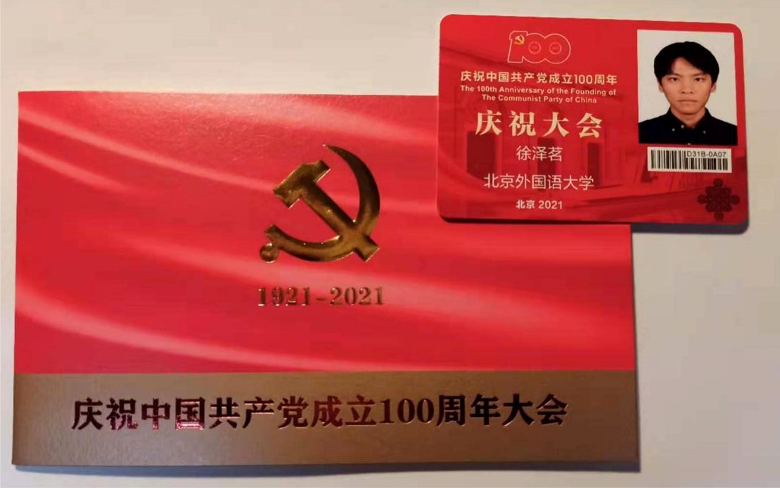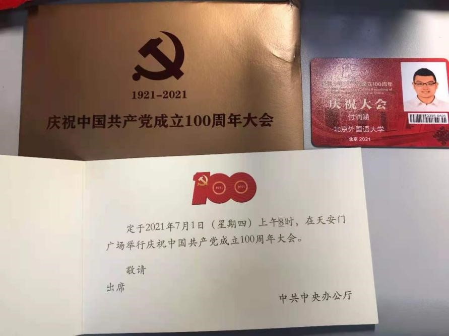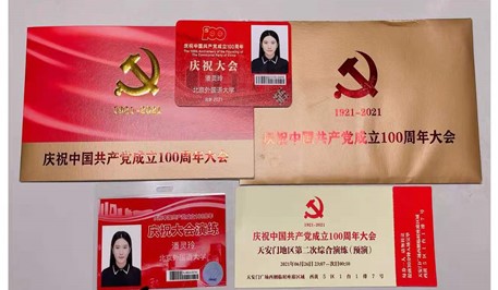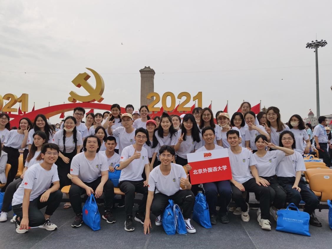 2021年7月1日,庆祝中国共产党成立100周年大会在天安门广场隆重举行,bw西汉姆联员工代表本科生付润涵,研究生潘灵玲、周顾盈、徐泽茗与北外其他院系员工代表共同前往天安门广场参加庆祝大会。
