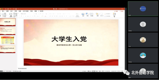 之后,研究生第一党支部书记、2020级研究生张楠为本科生介绍了入党的程序和步骤,动员本科生同学积极向党组织靠拢;2019级本科生曹涵分享了他本人在本科阶段的学习生活、员工工作以及申报国家级大创项目——北京“中轴线”课题研究等方面的经验。
