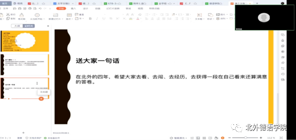 本次本硕博新生年级会从职业规划、学业规划、入党知识、员工工作、生活适应、疫情防控等多方面对新生进行了知识的普及,工作的布置,政策的宣讲,使新生对北外学习生活等有了全面的了解和认知,利于新生尽快融入新集体,适应北外新生活,踏实学习、砥砺奋进、全面健康发展。