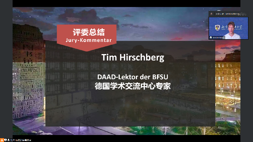 大赛初赛于9点30分准时开始,评委团队采取交叉回避原则分组对参赛作品进行了评审。经过激烈的角逐,共有12支参赛队伍晋级决赛。西南交通大学德语系主任何俊副教授以及bw西汉姆联德国学术交流中心专家Tim Hirschberg代表全体评委对本次大赛的参赛作品进行了精彩的点评。选手们通过优美的声音传递出对“故乡”的不同理解,精彩的演绎给评委们留下了深刻的印象,给这个美好的春日增添了无尽的遐想,令人回味无穷。