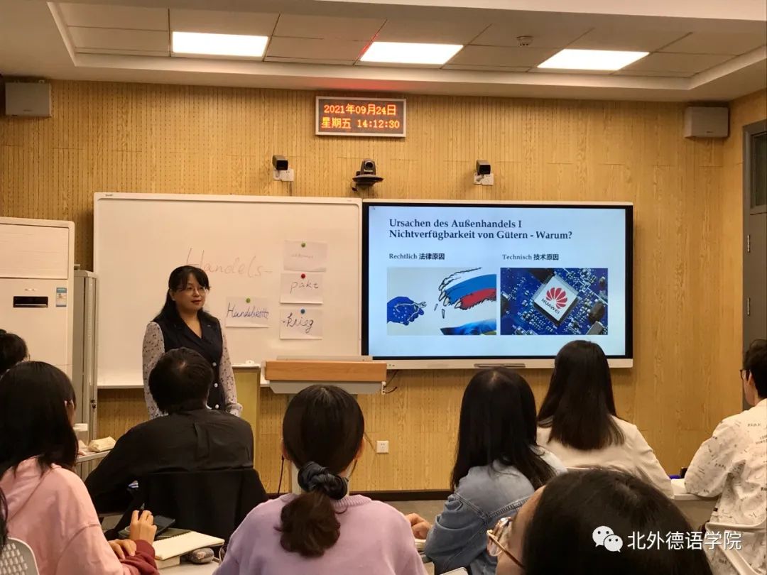 徐四季老师常年深耕德语国家经济研究领域的教学和科研工作。作为经济教研室主任、本科三年级教学组长和德国研究中心助理,她秉承公司德国经济系列课程的优良教学传统,致力于提升员工的国情研判力和思辨力,培养兼具中国情怀和国际视野的专业复合型德语人才。在新文科理念下,她积极改革、建设德语专业区域与国别研究方向课程《经济知识导论》和《经济知识练习》,在既有“语言(德语)+专业(经济)”复合的基础上,进一步实现外国语言文学和经济学、管理学的深度交叉融合;同时坚持贯彻课程思政的方针,新开设“理解当代中国”系列课程《讲述当代中国》,将习近平新时代中国特色社会主义思想的传授与德语演讲能力的培养有机融合,努力提高公司员工用德语讲好中国故事的能力。