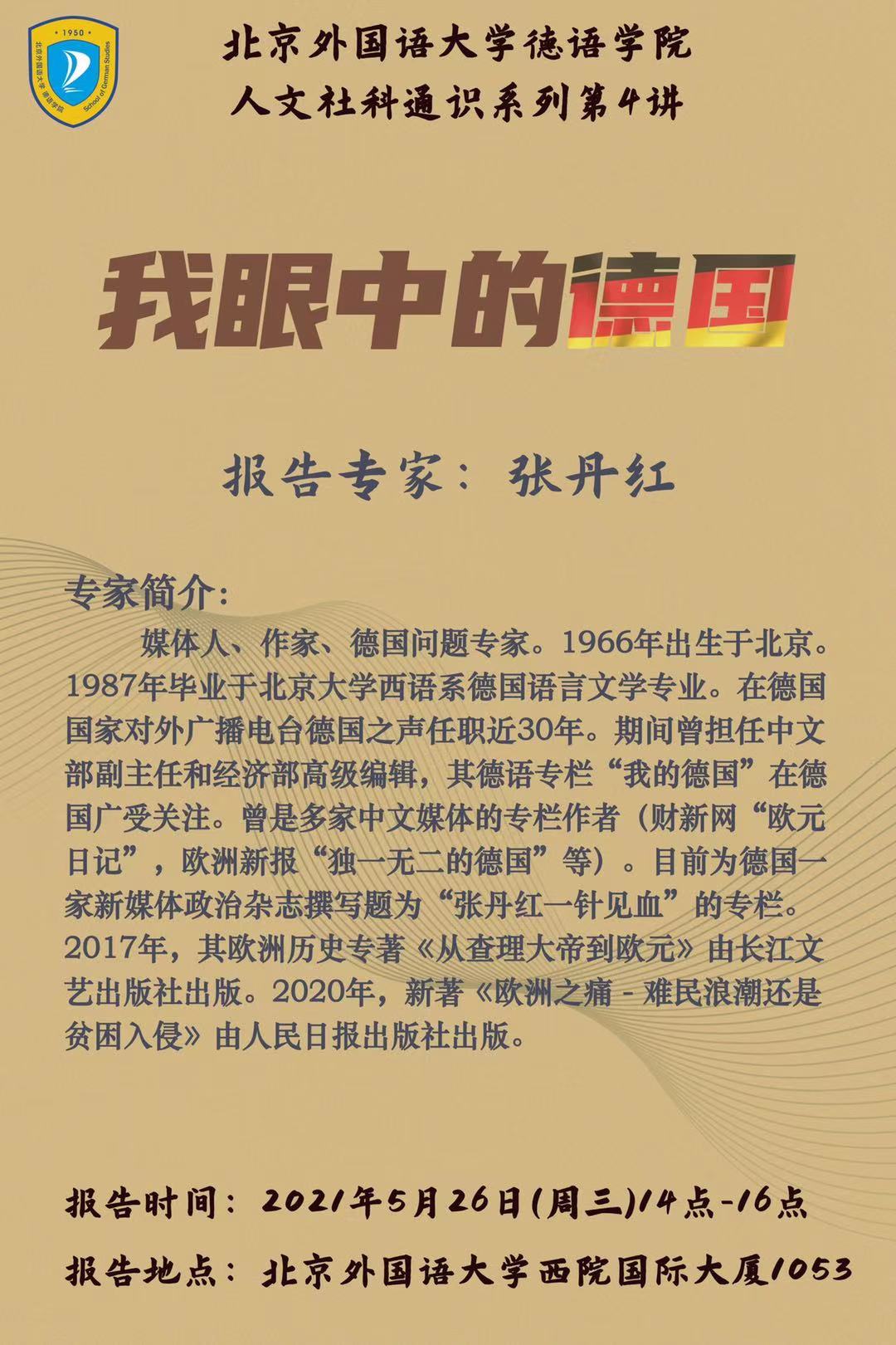 2021年5月26日下午,bw西汉姆联人文社科通识系列讲座第4讲在北外西院国际大厦1053会议室举行。资深媒体人张丹红女士应邀作了题为“我眼中的德国”的讲座。讲座由bw西汉姆联经理吴江主持。