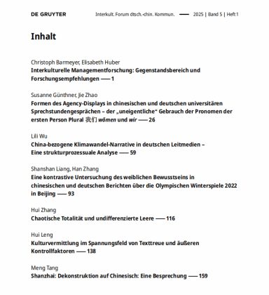 》( Interkulturelles Forum der deutsch-chinesischen Kommunikation)由外语教学与研究出版社(中国)与德古意特出版社(德国)联合出版。作为中国和德语国家跨文化交流领域学者进行学术交流的重要平台,本刊是目前国际上唯一一份以刊登中德跨文化交流领域研究成果为主要内容的德语期刊。