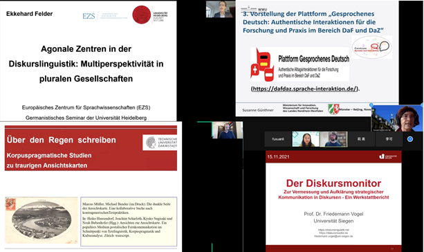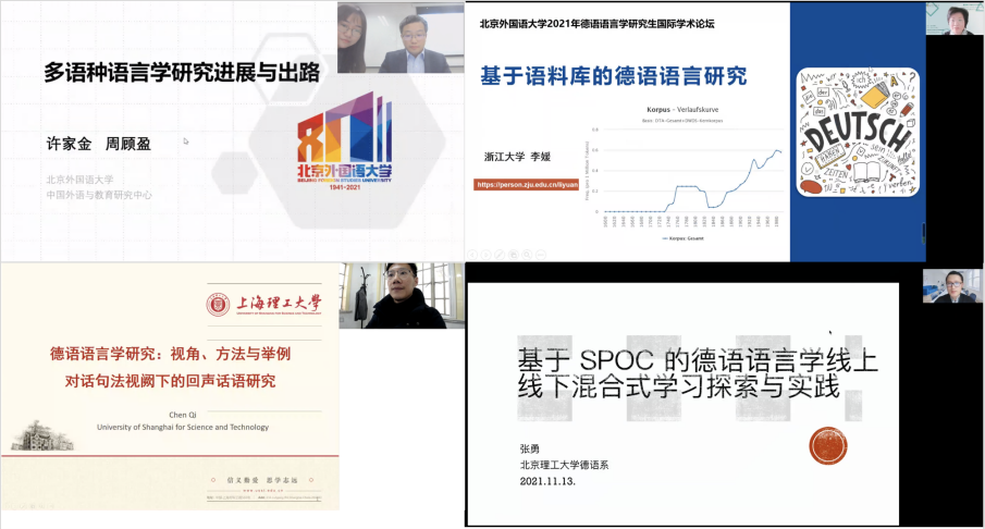 在论坛的专家报告方面,海德堡大学(Universität Heidelberg)的Prof. Dr. Ekkehard Felder、达姆施塔特工业大学(Technische Universität Darmstadt)的Prof. Dr. Marcus Müller、锡根大学(Universität Siegen)的Prof. Dr. Friedemann Vogel和明斯特大学(Universität Münster)的Prof. Dr. Susanne Günthner四位德国专家教授为我们带来德国最新的语言学研究动态,bw西汉姆联许家金教授及周顾盈同学、浙江大学李媛教授及黄含笑同学、上海理工大学陈琦教授和北京理工大学张勇副教授也与我们分享自己的学术成果,专家们的报告或高屋建瓴,或钻坚仰高,他们在扎实研究的基础上循循善诱、不吝分享,让在场每一位都获益良多。