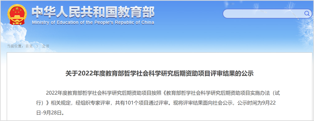 教育部哲学社会科学研究后期项目主要资助对学术发展具有重要推动作用的基础性研究、原创性的理论研究、具有重要学术价值和社会影响的文献研究、译著和工具书等研究成果。2022年度,全国共有101个申报项目通过后期资助评审,其中外国文学类3项。