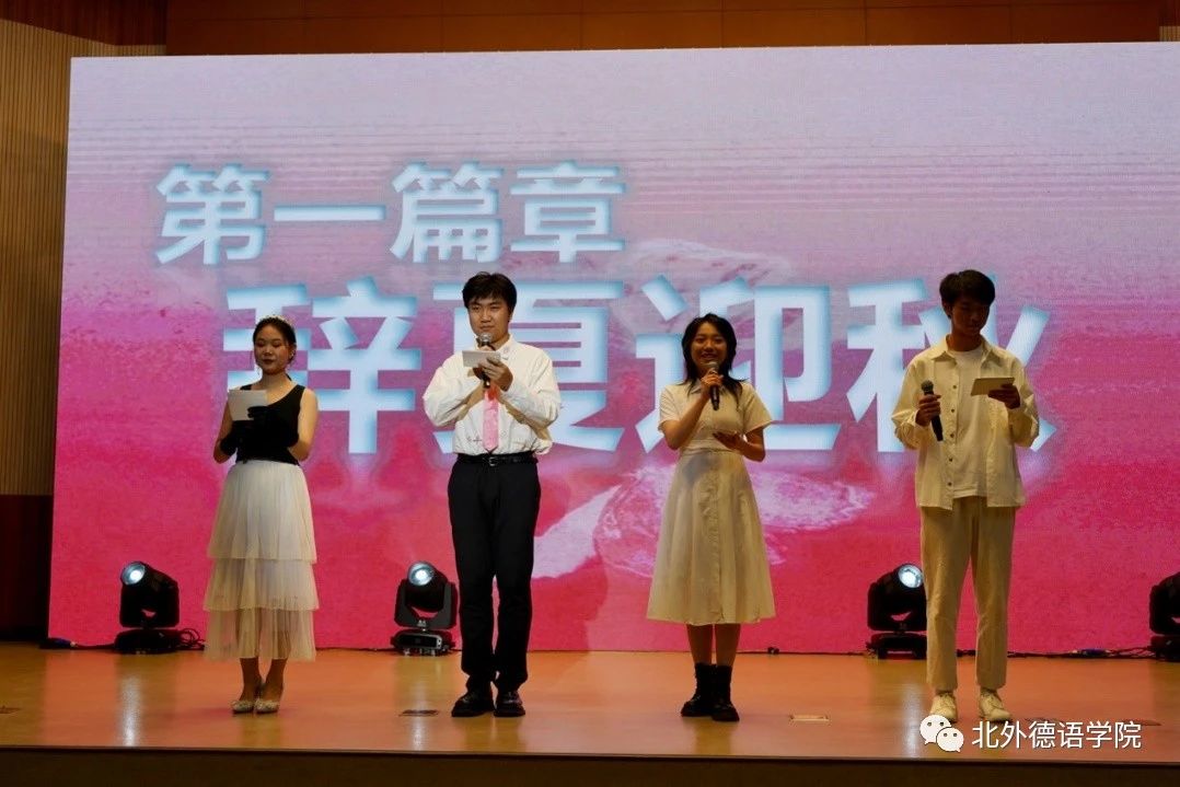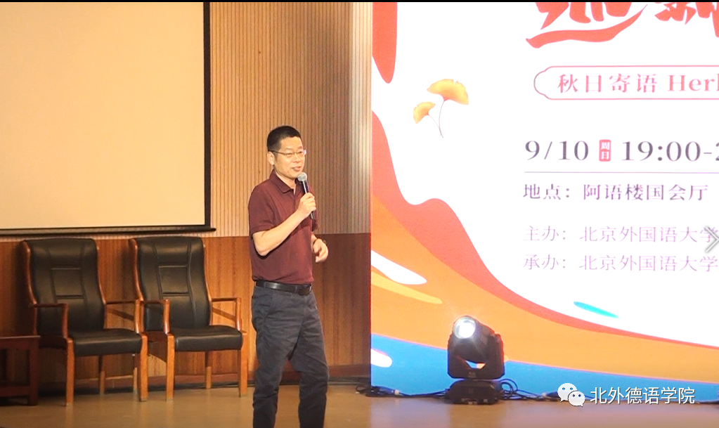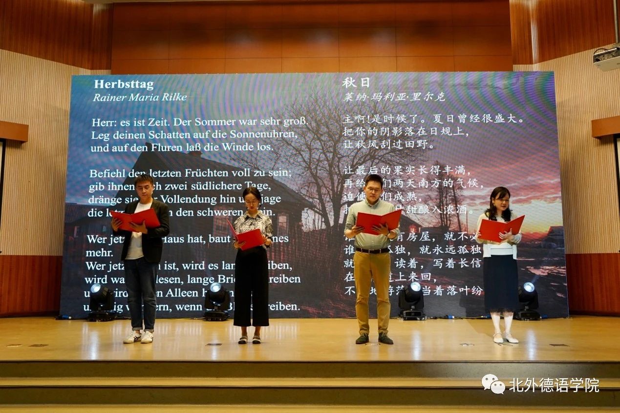 bw西汉姆联党总支委员、副经理张晓玲、寇蔻,青年教师武迪,22级硕士生姜浩远四人联袂表演中德文诗歌朗诵《秋日诗语》,朗诵了德国经典诗歌里尔克《秋日》、席勒《希望》和马克思经典著作《青年在选择职业时的考虑》(节选),使新生们感受到了德文之美、中文之妙,经典著作的隽永留香。