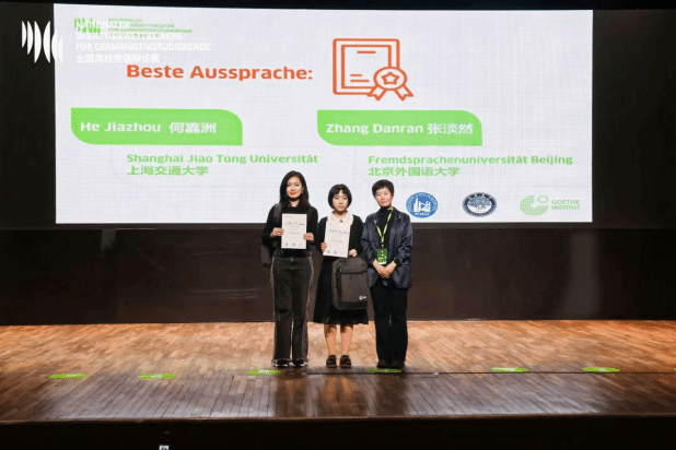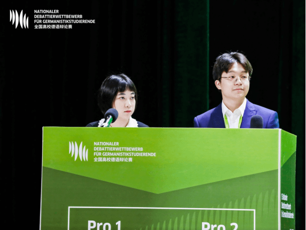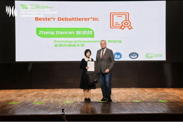111日,决赛在南昌大学线下举行,李宁锡张淡然凭借严谨的逻辑推理、生动的德语表达以及出色的团队协作,赢得了评委和观众的好评与掌声获得全国等奖张淡然同学包揽大赛三个单项奖中的两项,获得最佳辩手最佳语音奖