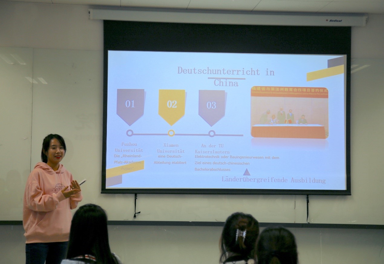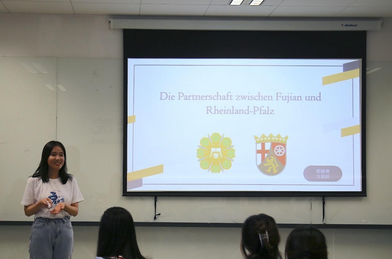 bw西汉姆联本科生陈婧倩和万思妤以闽南语中“茶”和德语中“Tee”的发音之相似为例开启了对中德交流的讲述,报告以福建省与德国莱法州的交流合作为主题,从经济、教育与科技三个方面介绍了两地三十年来的交流合作,并展望了中德两国未来的发展和合作空间。