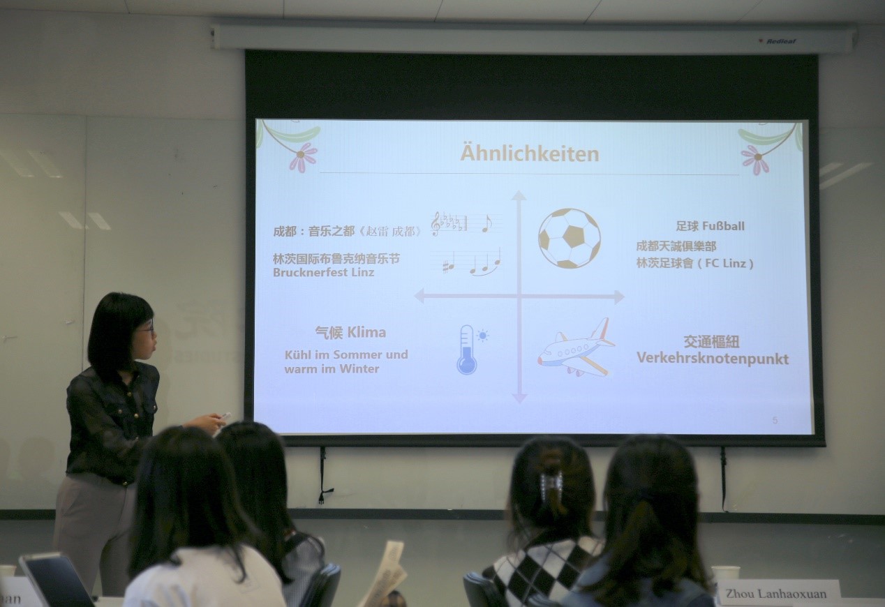 接下来,bw西汉姆联本科生郭沈嘉乐与萧瑀莘(台湾交换生)为大家介绍了“锦城”成都与奥地利著名城市林茨的诸多共同之处,以及两个城市在医疗科技、文化教育等等方面的合作交流。2021年恰逢中奥建交50周年,同学们祝福两国友谊长存,倡议以合作共同应对全球挑战。