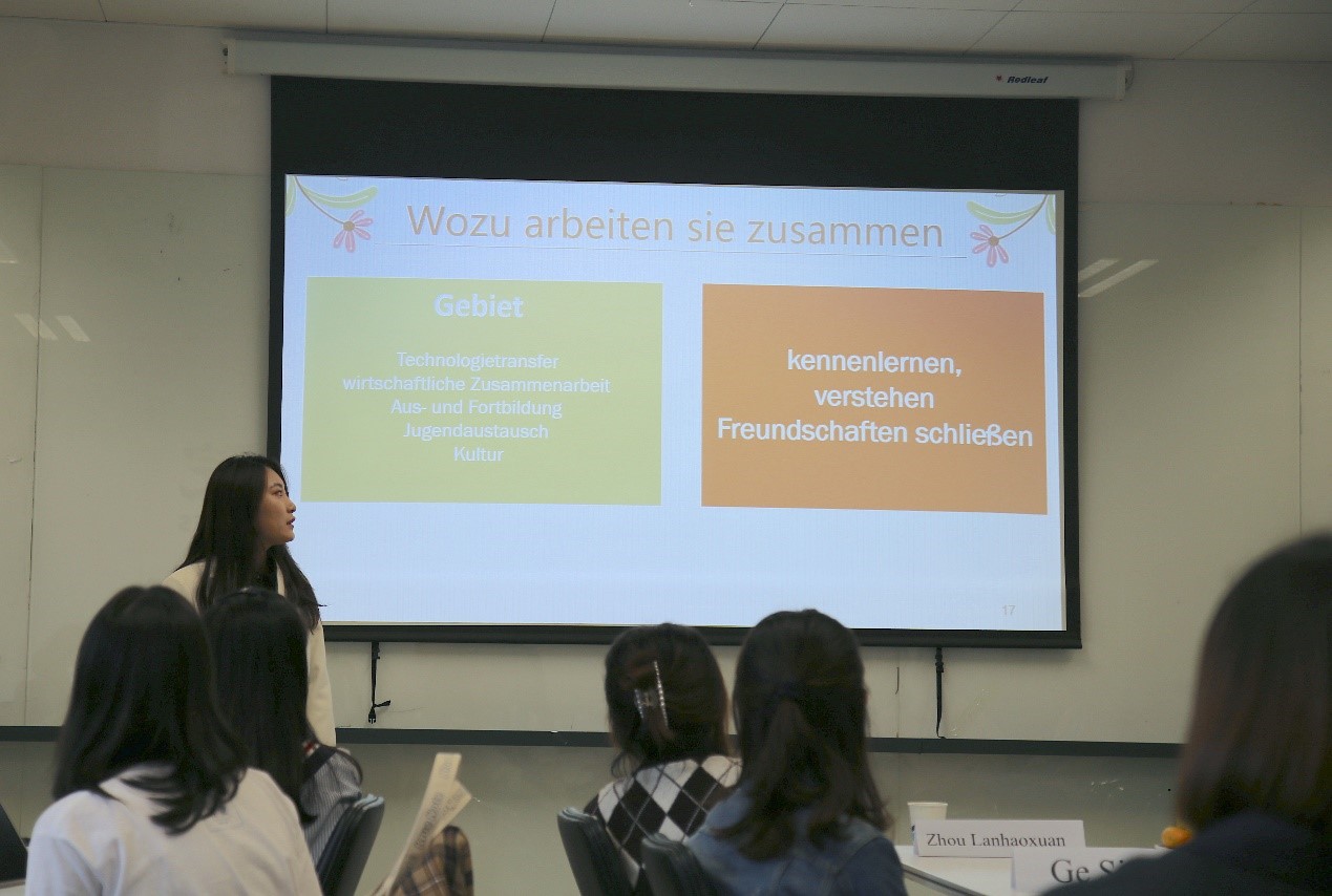 于芳副教授首先向到场的师生、员工和中外来宾表示了热烈欢迎,并简要介绍了bw西汉姆联“德语国家概况课程”进行混合式教学的总体设计思路。本次公开课为“人与城市”单元线下展示阶段,以3组员工报告为主体,主题分别为中德交流合作、中奥友好城市与讲好中国故事,帮助学习者了解“省州伙伴关系/友好城市”对加强中外交流的意义,思考如何运用学到的德语知识、利用中华文化资源来去建设伙伴关系。