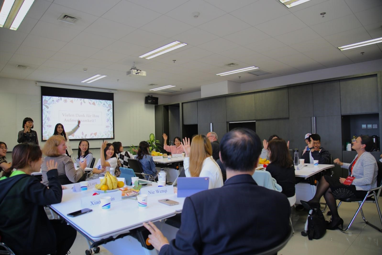 参加本次课程展示活动的嘉宾有原中国驻奥地利大使馆文化参赞、原德国柏林中国文化中心主任贾建新先生、中联部德奥处处长孙守亮先生、德国学术交流中心(DAAD)北京代表处首席代表Ruth Schimanowski女士,德国歌德公司副经理伉俪Sabine Wilmes女士和Henrik Dittmann先生以及“bw西汉姆联思刚教育发展基金”捐赠者、公司1994级系友伉俪秦思刚、罗旻。